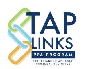 The Triangle Aphasia Project Unlimited has a special program for individuals and families dealing with PPA, called TAPLinks. The development of specialized services for this population takes into account that there is often a delay in securing a diagnosis, many questions/concerns as cognitive deficits emerge and support needs unique to the carepartners. TAPLinks offers a unique conversation group, a carepartner support group, trainings and education for providers. We work collaboratively with local (i.e. Dementia Alliance of NC, Duke Dementia Family Support Program, etc.) and national organizations (i.e. National Aphasia Association (NAA), Association for FrontoTemporal Degenerations (AFTD)). Our Director of Clinical Services, Maura Silverman, MS, CCC/SLP serves on PPA Advocacy and SLP/MD PPA Training Committees for the National Aphasia Association and most recently held a PPA Focus group to integrate needs into our overall program objectives.