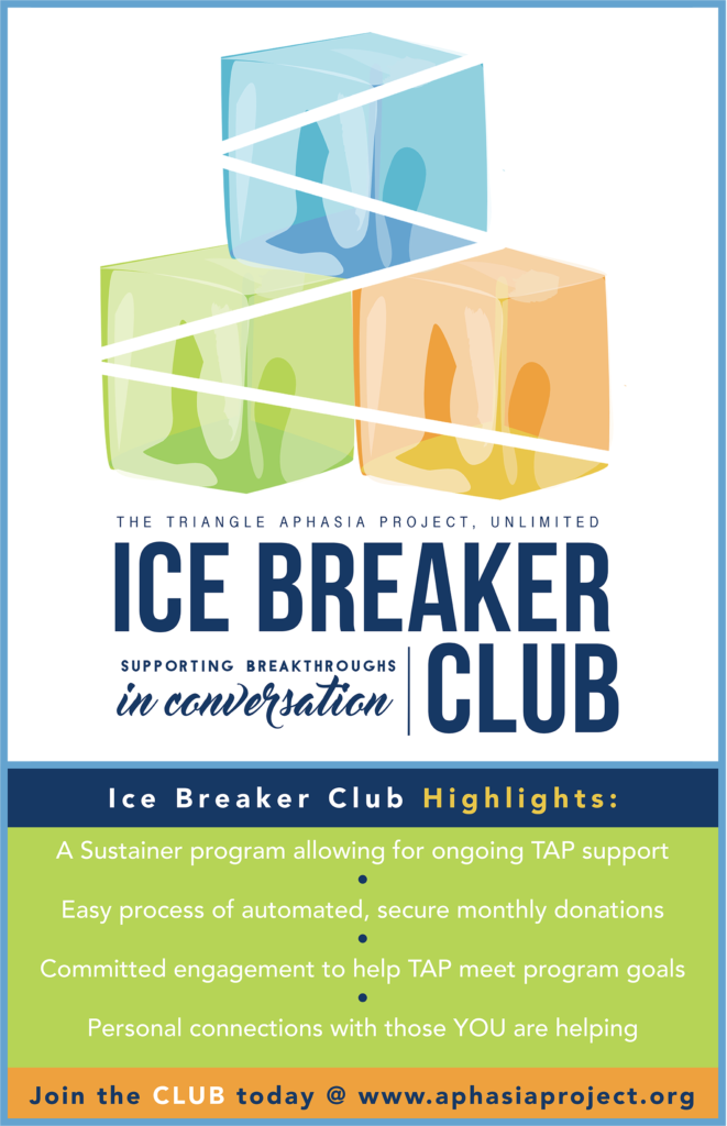 TAP Unlimited’s End of Year Campaign provides TAP Stakeholders an opportunity to embrace the reason for our efforts and hear from those who have been impacted by aphasia. Aphasia, as you know, can be a devastating impairment resulting in social isolation, depression and disengagement from the passions and purpose of an individual’s life. It can interrupt a career, destroy plans for retirement and threaten relationships. TAP Unlimited is embarking on its 18th year of service to those effected by aphasia across the Triangle and beyond.