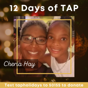 As excited as we are that Cheria has agreed to share her story of TAP for these 12 Days…we are even more thrilled that she has recently accepted a position on our Board of Directors! Thank You Cheria for sharing your time, talent and expertise.