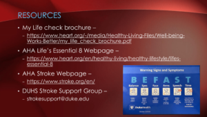 • Duke University Hospital Stroke Support Group: Interested? email strokesupport@duke.edu