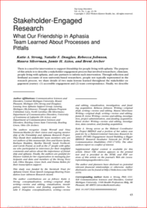 Article: Strong, Katie A.; Douglas, Natalie F.; Johnson, Rebecca; Silverman, Maura; Azios, Jamie H.; Archer, Brent. Stakeholder-Engaged Research: What Our Friendship in Aphasia Team Learned About Processes and Pitfalls. Topics in Language Disorders 43(1):p 43-56, January/March 2023.